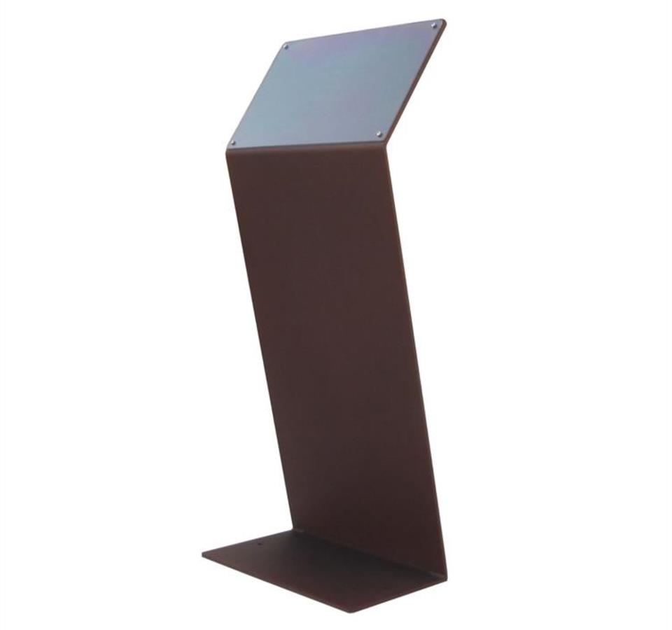 Leggio tipo Corten realizzato interamente in lamiera d'acciaio sagomata con tecnologia laser. Dimensioni tabella cm 50x30 h, dotata di lastra protettiva in policarbonato compatto trasparente mm. 4.
