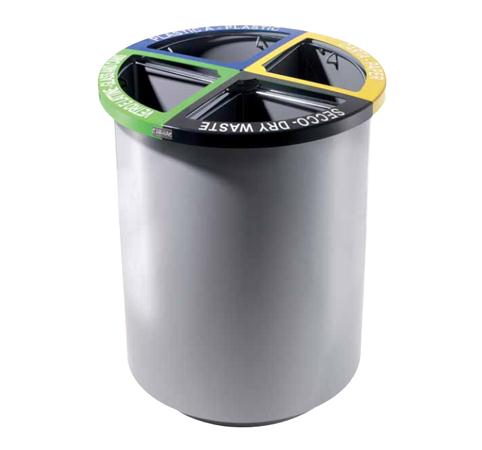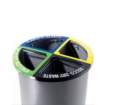 Il cestino è diviso in 4 diversi settori (Vetro - Carta - Plastica - Secco) tramite pannelli in lamiera d'acciaio ciascuna completa di reggisacco in trafilato d'acciaio saldato ad un sostegno centrale.