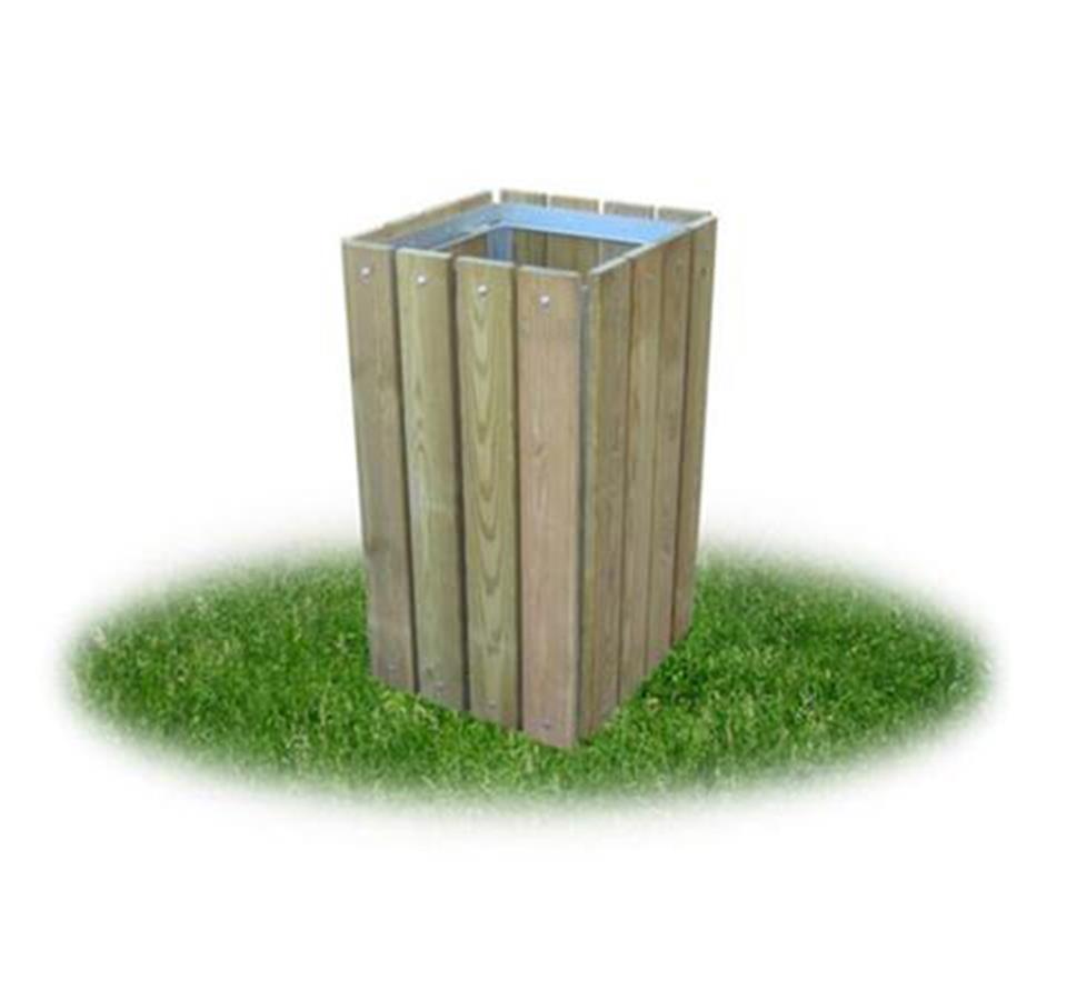 Cestino rivestito in legno con telaio realizzato mediante profili d'acciaio pieno zincato, rivestito con doghe in pino impregnato in autoclave mediante sali atossici (sez. mm. 90 x 20 x 810).
