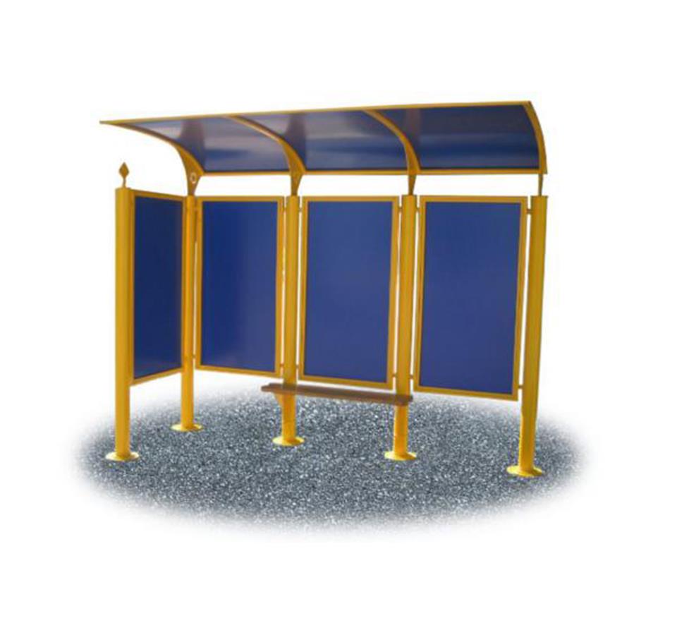 Canopy constructed from 90 mm diameter galvanized steel tube uprights, with laser-shaped sheet steel roofing supports at the upper ends. The roof frame is made of 40 x 30 mm section tubes, the roofing is supported by laser-shaped sheet metal elements, and the seat is composed of two laser-shaped sheet metal supports and two 110 x 45 mm exotic wood slats. The powders used in the painting process are non-toxic in accordance with current regulations. RAL color is available at the customer's discretion.