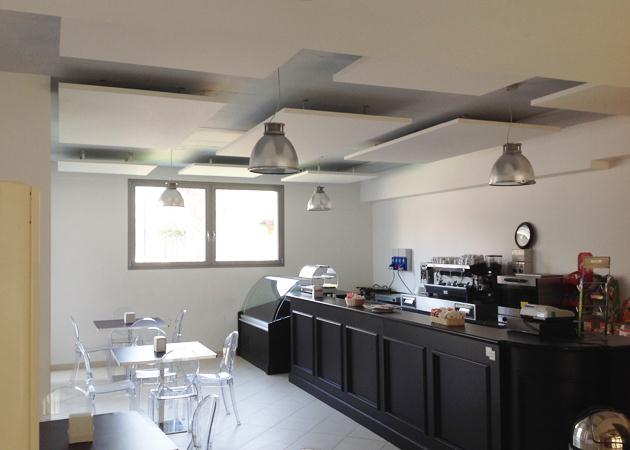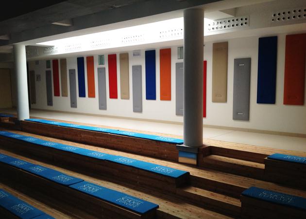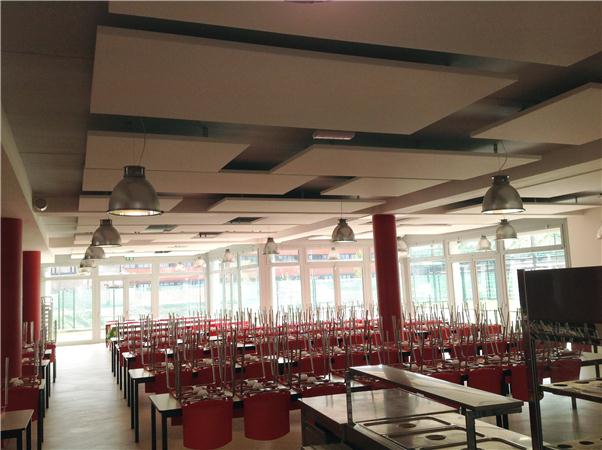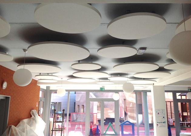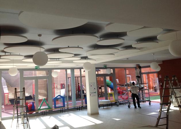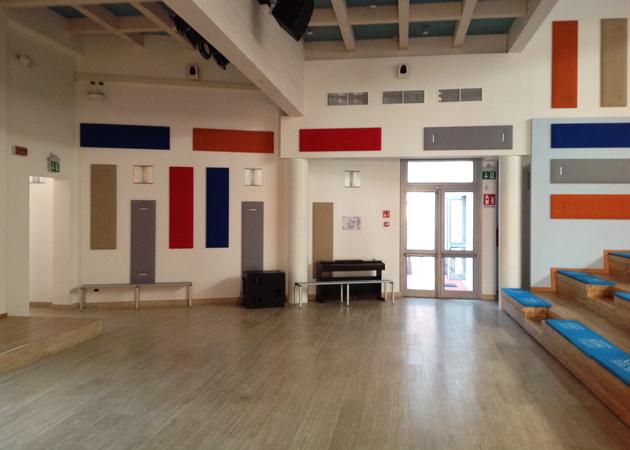 Progettazione e installazione di pannelli a soffitto e a muro ad alto assorbimento acustico, per alcune aree della sede di Baranzate (MI) dell'International School Milano.