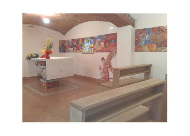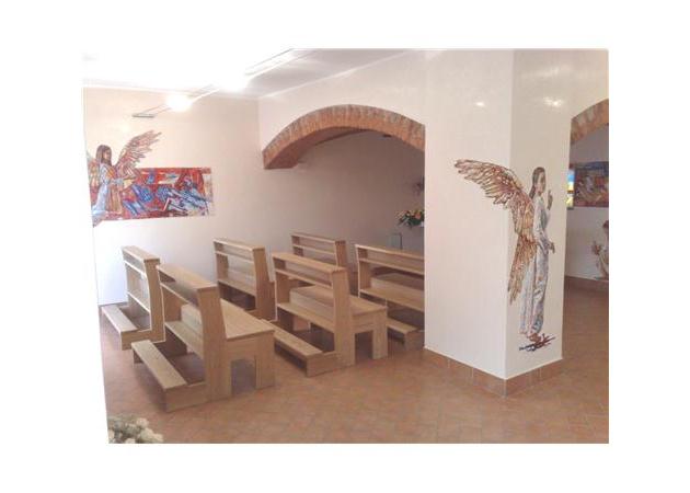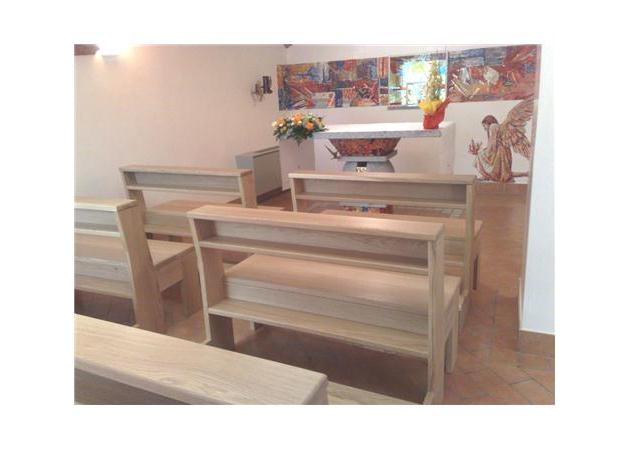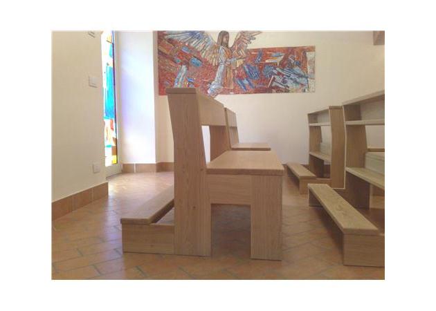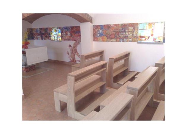 Progettazione e realizzazione su misura dei nuovi banchi in legno per la piccola cappella appena restaurata a Leggiuno, in provincia di Varese.