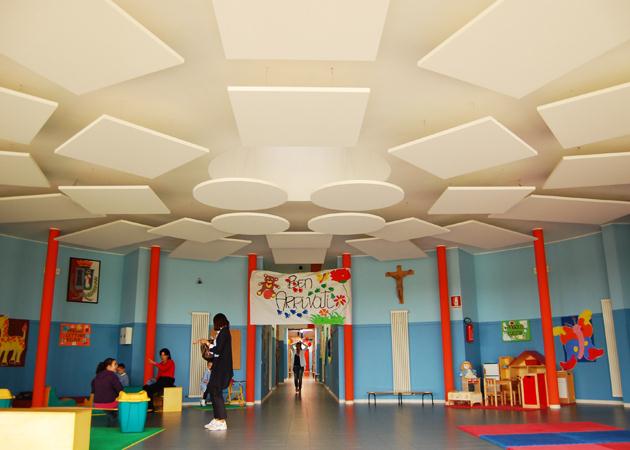 L'opera di insonorizzazione è stata realizzata nella scuola di Azzano S. Paolo a Bergamo, dove l'area gioco, che può ospitare contemporaneamente anche 200 bambini, presentava una pessima acustica e di conseguenza problematiche di forte rumore e confusione. Sono stati applicati al soffitto pannelli insonorizzanti di forme diverse che hanno migliorato l'acustica rendendo allo stesso tempo lo spazio giocoso e divertente.
