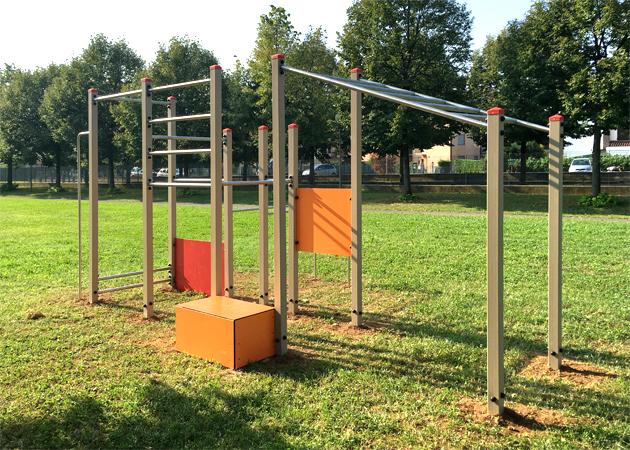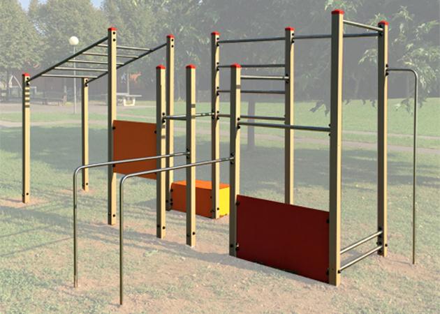 Barre per trazioni a diverse altezze, barre per addominali, parallele, traversi e step-up, consentono la pratica di esercizi di forza ed equilibrio per il mantenimento del benessere fisico.
