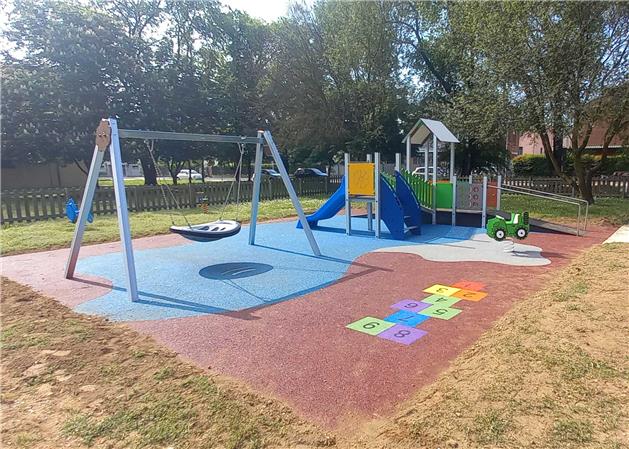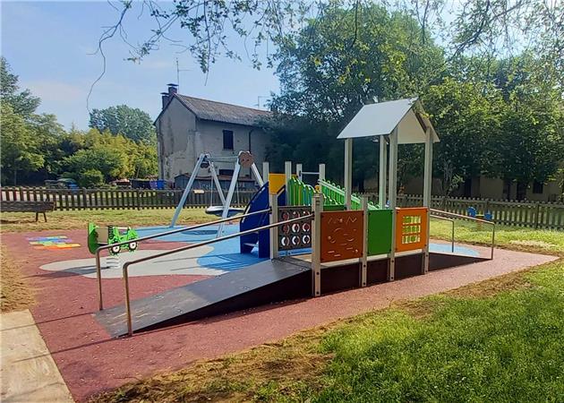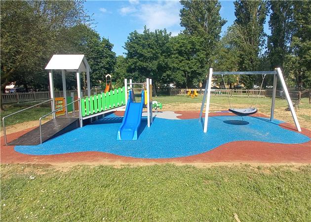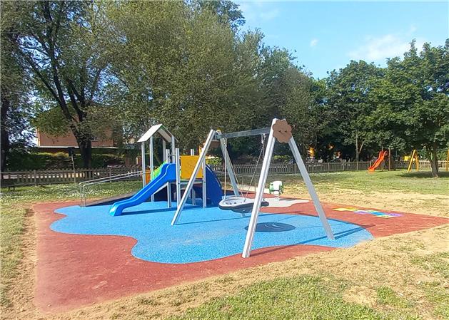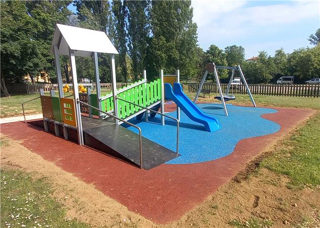 Un castello inclusivo, con scivolo e pedana, dotato di pannelli gioco e una altalena con cestone accessibile a tutti. La pavimentazione antitrauma colata in opera è stata personalizzata con colori e disegni.