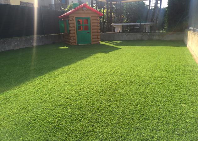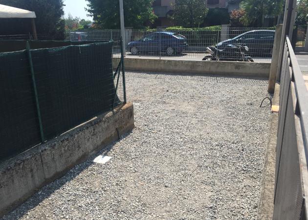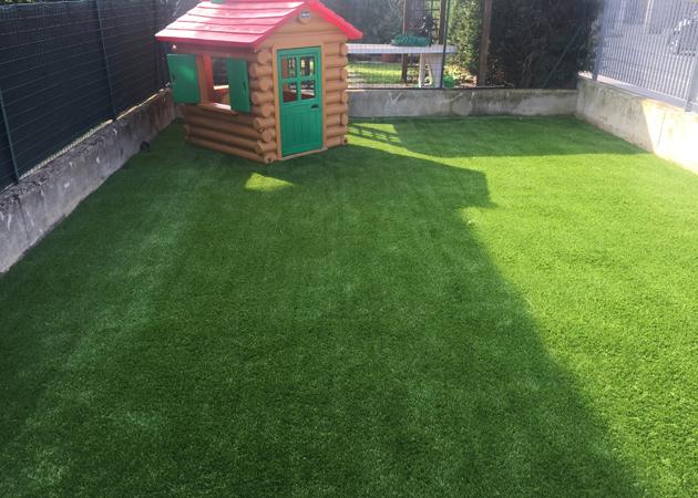 Prima e dopo di posa in opera di manto in erba sintetica, posato in una sola giornata di lavoro ad Azzano San Paolo (BG).
