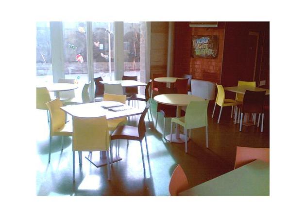 Bar realizzato e progettato secondo le esigenze del cliente, con tavoli e sedie di colori e forme diverse, con bancone e retrobanco attrezzato.