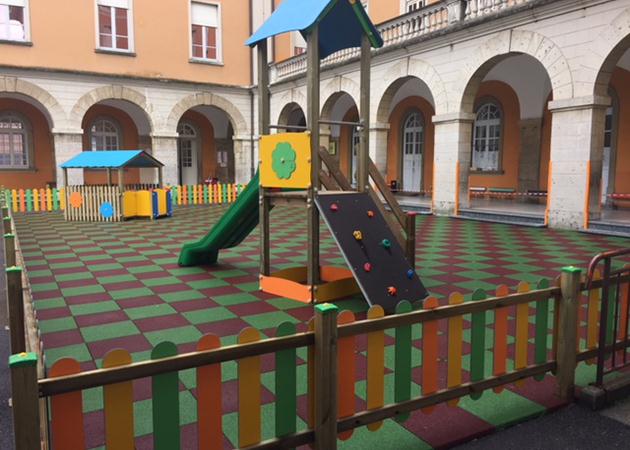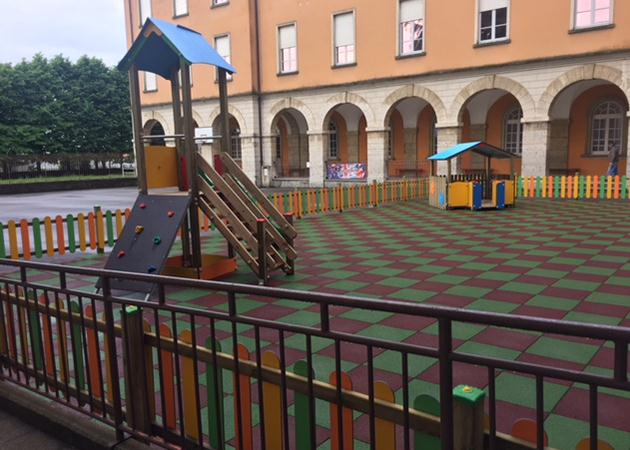 Abbiamo realizzato, per la scuola materna di Torre Boldone, un'area gioco divertente e sicura. La torre e la casetta gioco sono inserite in un'area messa in sicurezza dalla pavimentazione antitrauma colorata, e dalle staccionate che ne delimitano lo spazio.