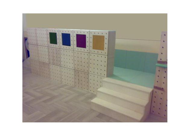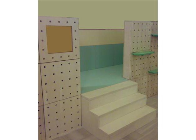 La struttura è composta da elementi contenitore modulari, che formano una parete attrezzata dietro la quale corre un percorso rialzato, il quale diventa spazio ludico per i più piccoli. Un unico oggetto che assolve a 2 funzioni: contenitore per i grandi, percorso dinamico per i più piccoli.