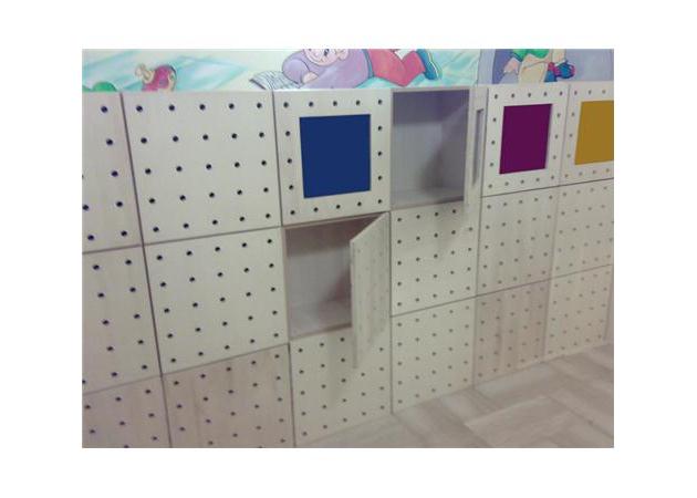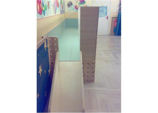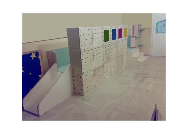 La struttura è composta da elementi contenitore modulari, che pormano una parete attrezzata dietro la quale corre un percorso rialzato, che diventa spazio ludico per i più piccoli. Un unico oggetto che assolve a 2 funzione: contenito