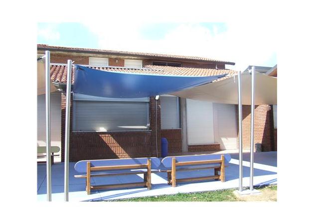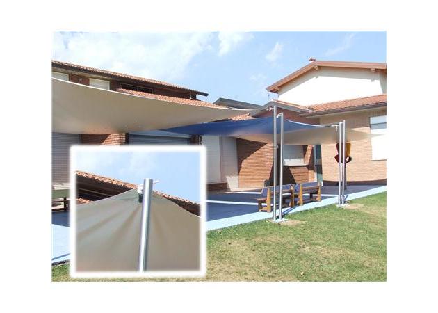 Gazebo con stuttura in metallo e copertura in pvc. Il telo è facilmente posizionabile, con dei fori di scolo dell'acqua piovana. La struttura garantisce ombreggiamento e protezione dal sole, dando la possibilità di sfruttare le parti esterne anche nelle ore più calde della giornata