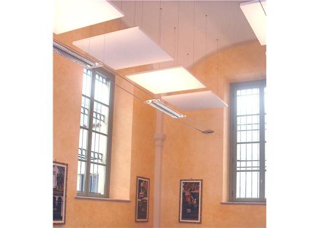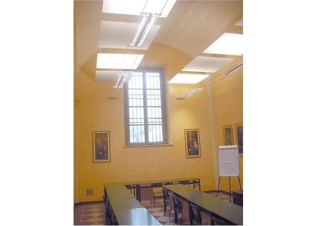 Intervento di insonorizzazione in un palazzo storico con volte a botte. In questo caso si è scelto di adottare una soluzione che prevede dei pannelli sospesi con cavi d'acciaio al soffitto, per mantenere in vista la copertura storica e migliore l'acustica al tempo stesso. Nle progetto si è integrato lo studio dell'illuminazione(in questo caso si è scelto di adottare un sistema a luce indiretta che ben si adatta con gli ambienti)