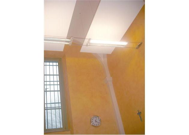 Intervento di insonorizzazione in un palazzo storico con volte a botte. In questo caso si è scelto di adottare una soluzione che prevede dei pannelli sospesi con cavi d'acciaio al soffitto, per mantenere in vista la copertura storica e migliore l'acustica al tempo stesso. Nle progetto si è integrato