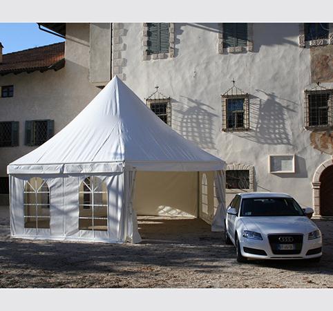 Disponibili nelle dimensioni 3x3 mt e 4x4 mt, con soffitto standard o alto. Comprendono pareti e tetto in PVC, 1 ingresso. Su richiesta sono disponibili altre configurazioni (tenda esagonale, ottagonale)