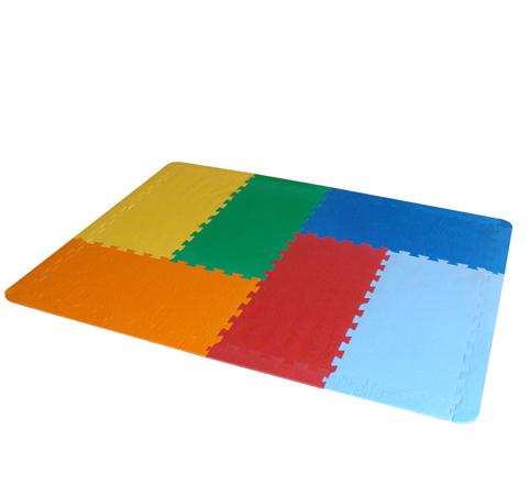 Kit pavimentazione in E.V.A., densità 100 Kg/mc (copolimero etilene - acetato di vinile), composto da 12 lastre in differenti colori: blu/rosso/verde/azzurro/giallo/arancione; completo di bordi e angolI. Le pavimentazioni antitrauma nascono dalla necessità di ridurre gli incidenti ed i problemi legati alla sicurezza negli spazi interni, in questo caso si aggiunge anche un attenzione speciale al colore e alla praticità.