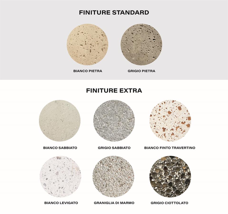 - Finiture extra (su richiesta): grigio sabbiato, bianco sabbiato, finto travertino, graniglia di marmo, bianco levigato e grigio ciottolato.