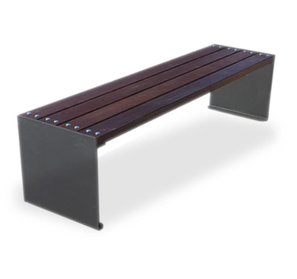 Panca con struttura in lamiera d’acciaio sp. 80/10 sagomata con tecnologia laser. Seduta composta da n. 4 profili in legno esotico opportunamente trattato.