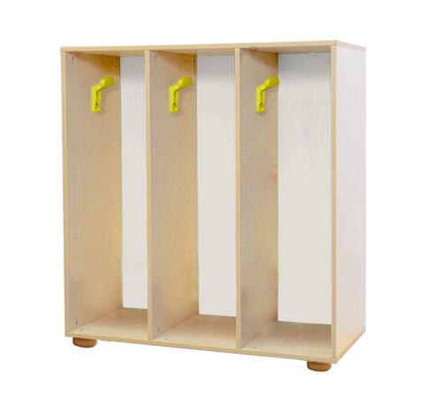Spogliatoio a giorno a 3 / 6 posti con struttura in bilaminato idrofugo, spessore 22 mm, in classe E1, privo di formaldeide, bordatura in ABS stondato e piedini in massello di faggio. La parte interna è attrezzata con grucce appendiabiti e possibilità di aggiunta ripiano. Disponibile in vari colori.